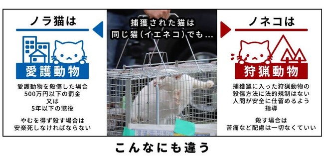 また、環境省は、パブリックコメントにおいて “生物学的な分類ではペットとして飼われているネコ、イヌと変わりませんが、飼い主の元を離れて常時山野等にいて、専ら野生生物を捕食し生息している個体を「ノイヌ」「ノネコ」としており、飼い主の元を離れてはいても、市街地または村落を徘徊しているようないわゆる「ノラネコ」「ノライヌ」は「ノネコ」「ノイヌ」には該当せず、鳥獣保護管理法の対象にはなりません。”と回答しています。