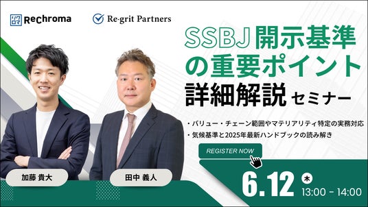 株式会社Re-grit Partners(本社:東京都千代田区、代表取締役社長:山木 智史、以下「当社」)とリクロマ株式会社(本社:東京都渋谷区、代表取締役社長:加藤 貴大氏)はSSBJ(サステナビリティ基準委員会)開示基準の重要ポイントを分かりやすく解説するオンラインセミナーを開催いたします。本セミナーでは、SSBJ開示基準の「マテリアリティ特定」「バリュー・チェーン範囲の決定」「気候基準対応」などSSBJ開示基準の適用に向けて押さえておきたい重要ポイントを当社のコンサルタントである田中と、リクロマ(株) の加藤氏が詳細解説いたします。特に、適用基準では、バリュー・チェーン範囲の決定や、財務に影響する重要性判断のプロセスに基づいた重要な情報の識別が求められていることから、対応する企業に認識していただきたい重要な点をお伝えいたします。また、気候基準も、TCFDより具体的な詳細基準が定められています。本セミナーでは、これらの重要ポイントと具体的な対応方法について紹介いたします。