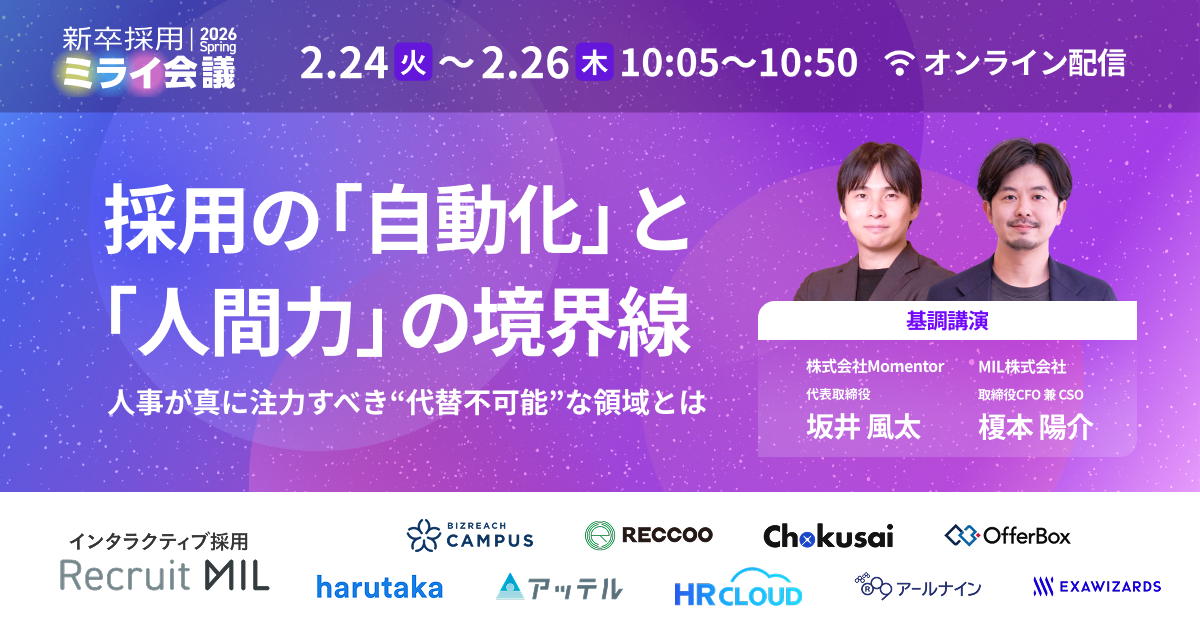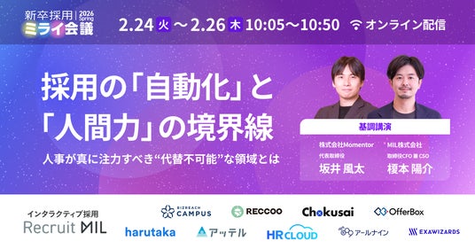 インタラクティブ採用で企業と学生の「相互理解」を支援するMIL株式会社(本社:東京都新宿区、代表取締役CEO:光岡 敦、以下 MIL)は、2026年2月24日(火)・25日(水)・26日(木)に、オンラインカンファレンス「新卒採用ミライ会議 2026 春」を開催いたします。