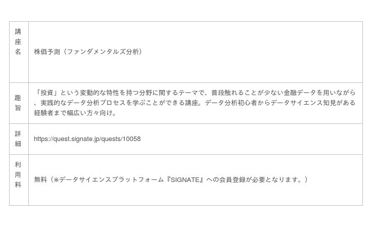 AI開発・運用、AI人材の育成・採用支援サービスを提供する株式会社SIGNATE(本社:東京都千代田区、代表取締役社長:齊藤 秀)は、AI/データ分析の個人向けe-learningサービス「SIGNATE Quest」にて、株式会社日本取引所グループ(本社:東京都中央区、取締役 兼 代表執行役グループCEO:清田 瞭、以下、JPX)が提供する教材『株価予測(ファンダメンタルズ分析)』を、本年11月8日(月)よりオンライン講座として公開いたしました。