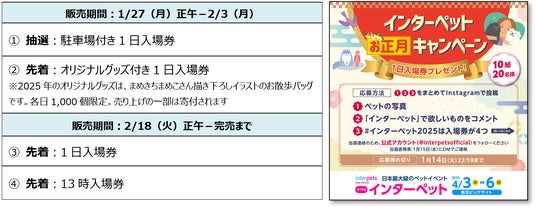 「インターペット」では入場券販売に先駆け、公式インスタグラムにて「インターペットお正月キャンペーン」を実施中です。(1)ペットの写真、(2)「インターペット」で欲しいもの、(3)ハッシュタグ「#インターペット2025は入場券が4つ」をまとめて投稿すると、抽選で10組20名様に1日入場券が当たります。応募受付は1月14日(火)まで。なお、入場券の購入に関する詳細は1月15日(水)から特設サイトで公開予定です。