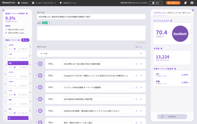 EmmaToolsには、SEOの品質を見ながらライティングできる機能が備わっており、コンテンツ管理画面からすぐに修正・更新に取り掛かることができます。
