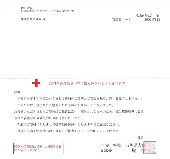令和5年5月能登地方地震災害義援金に寄付したことをお知らせいたします。