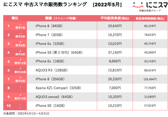 にこスマ 中古スマホ販売数ランキング [2022年5月]