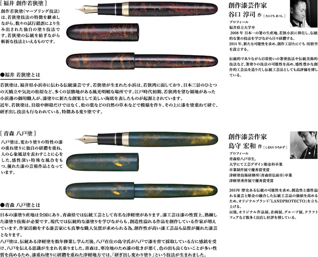 伝統漆芸 麗 は、「漆」を塗り上げ装飾する伝統漆芸を用いた筆記具のシリーズです。2019 年6 月、シリーズの第一弾として、「輪島 曙塗」、「輪島 溜塗」、「津軽錆塗」を発売しました。第二弾は2021 年10 月、「岩手樹水塗」、「青森 流紋塗」、「石川 創作加賀塗」の3 種を発売。そして第三弾は「福井 創作若狭塗」、「青森 八戸塗」を発売いたします。