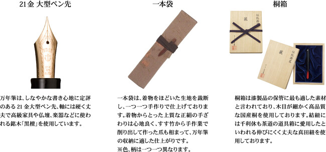 専用一本袋(国産)、クリーニングクロス、万年筆使用説明書、専用商品説明書カード