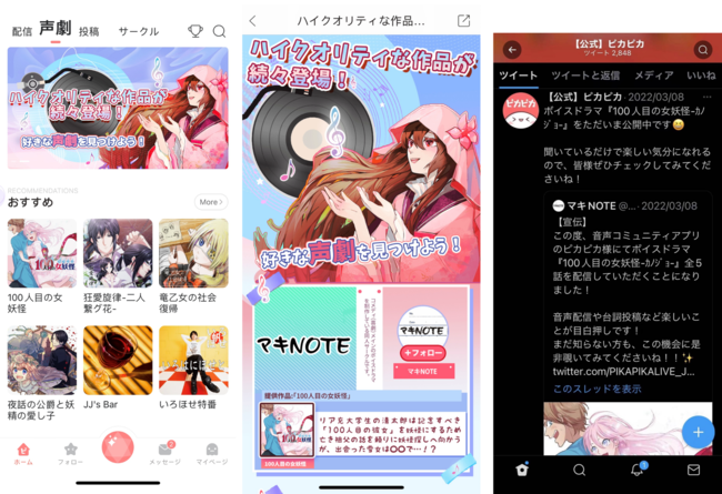 オリジナルボイスドラマサークルは、ピカピカの新機能「声劇エリア」でアカウントを作成、様々なジャンルで100本以上のボイスドラマを提供されてます。その中で、マキNOTE様の作品が注目され、多くのユーザーから好評を得て、人気度アップします。