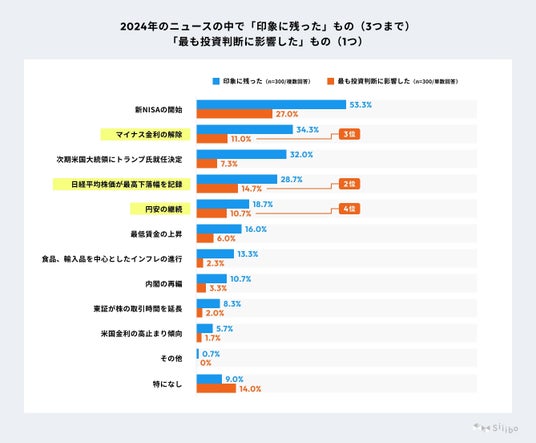 2024年のニュースの中で「印象に残っているもの」を3つまでと「投資判断に最も影響したもの」を質問したところ、「新NISAの開始」がどちらにおいても突出して1位でした。