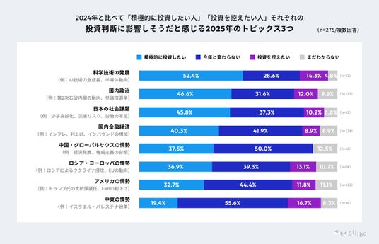 また、2025年の投資判断に影響しそうだと感じるトピックスを3つまで選択してもらったところ、「科学技術の発展」、「国内政治」、「日本の社会課題」、「国内金融経済」の国内トピックスについては、「積極的に投資したい」人が、「投資を控えたい」人よりも30ポイント以上多く選択した結果になりました。国内の動向に関するトピックスが、「積極的に投資したい」意向の背景にあることが伺えます。