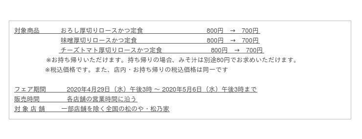 このたび松屋フーズ(本社:東京都武蔵野市、代表取締役社長:瓦葺一利)では、とんかつ専門店の「松のや・松乃家」におきまして、2020年4月29日午後3時から5月6日(水)午後3時までの期間限定で、「厚切りロースかつトッピング関連メニュー100円引きフェア」を開催いたします。