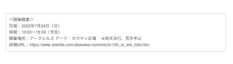 森ビル株式会社が運営するアークヒルズ(東京都港区)では、「赤坂蚤の市 in ARK HILLS」の開催100回を記念し、お客さまやイベントを一緒に盛り上げてきた出店者の皆さんへの感謝を込めて「赤坂蚤の市 in ARK HILLS 第100回記念特別企画~100e anniversaire~」を、7月24日(日)にアーク・カラヤン広場で開催します。