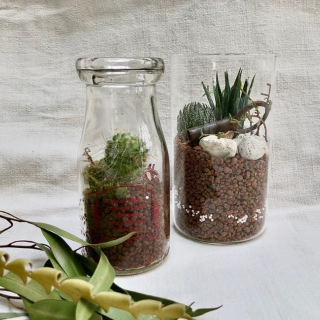 ガラスの中に多肉植物を選んで植えて、多肉植物のテラリウムを作ります。