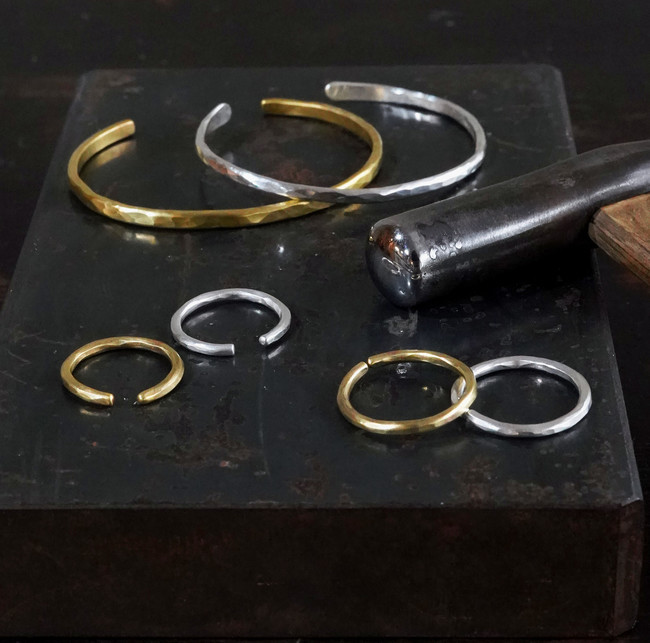 彫金技法や日本の伝統文様、日本の古いものたち、それらをデザインソースにする「nibi」では、ハンマーで模様を打った真鍮やシルバーを使い、リングやバングル、イヤーカフの制作体験ができます。