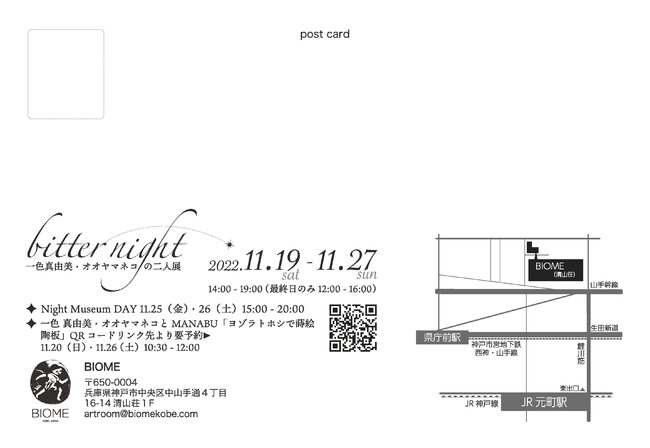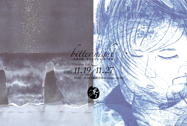 一色真由美とオオヤマネコの二人作品展「bitter night」が11月19日(土)から神戸BIOMEで始まります。