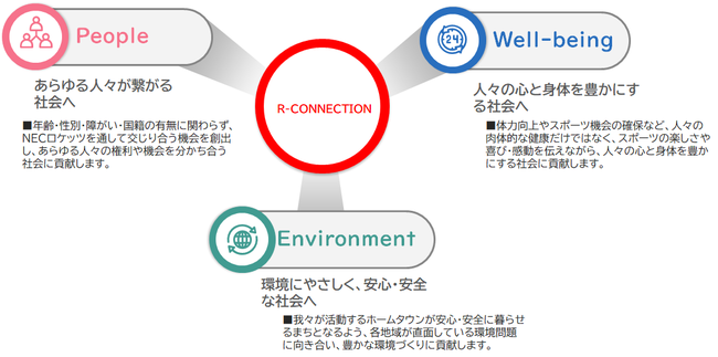 あらゆる人々一人ひとりが輝く社会となるために、NECロケッツが人やコミュニティー、そして社会をつなぐ”懸け橋”(CONNECTION)となる!「R-CONNECTION」には、このような想いが込められております。自分たちの