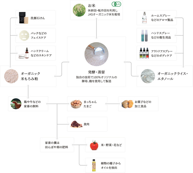 奥州市の休耕田を再生し栽培したオーガニック米を発酵・蒸留し、抽出したオガーニックライスエタノールと発酵粕を使用した自社ブランドを開発・製造しています。奥州市内では、下記の店舗で販売しています。