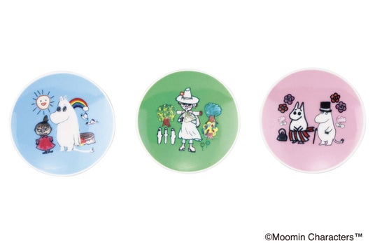 豆皿(青空ピクニック/小道を散歩/お花のリース)子どもたちの描いた「ムーミン」のイラストをデザインした豆皿3種類。あたたかみのある雰囲気が食卓にやさしい彩りを添えます。おやつや副菜を盛り付けるのにぴったりです。