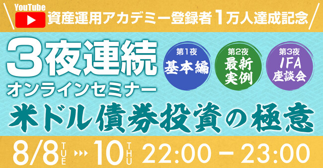 富裕層向けにIFA事業始め、資産運用のコンサルティングを行う株式会社ウェルス・パートナー(代表取締役:世古口俊介、本社:東京都港区、以下「弊社」)は、2023年8月8日(火)~8月10日(木)22:00~23:00にYouTubeチャンネル「世古口俊介の資産運用アカデミー」のチャンネル登録者1万人達成記念として3夜連続オンラインセミナー「米ドル債券投資の極意」を開催いたします。