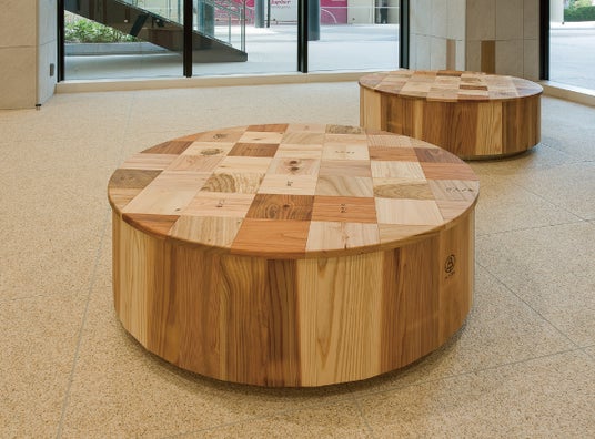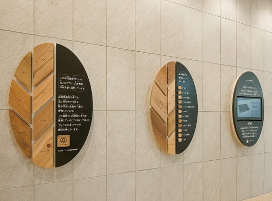 内装材やサインには、兵庫県産の木材、神戸市の保管していた間伐材を活用しました。加えて、イチョウ、カエデ、サクラ、クスノキなど、多様な兵庫県産の樹種や木目の違いを楽しむことができるテーブルを制作。大人も子供も兵庫の森林や木材を身近に感じ、自然との関りを考えるきっかけとなるよう、それぞれの木材を説明するパネルも設置しました。