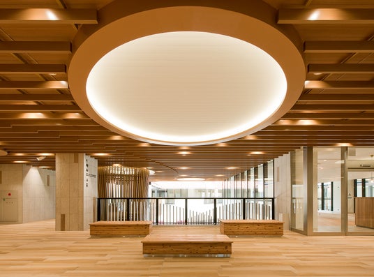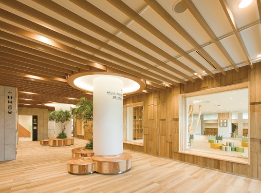 「晴れた日には木漏れ日で涼み、雨の日には雨宿りとして集う憩いの場 名谷を見守るはぐくみの森」という建物コンセプトを内装デザインに昇華し、木のぬくもりを感じられる憩いの場を創出しました。施設の顔となるエントランスは、市民が気軽に立ち寄ることができるよう、吹き抜けによる開放的な空間としています。