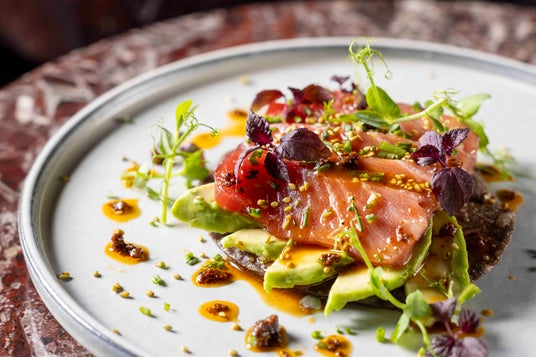 特 徴: 「森のバター」と呼ばれる栄養価の高いアボカドと、程よく乗った脂が口の中で溶け出す本マグロの中トロを、タコス生地のトルティーヤを油で揚げたトスターダの上にトッピングし、柚子胡椒サルサと一緒に楽しめる一品。