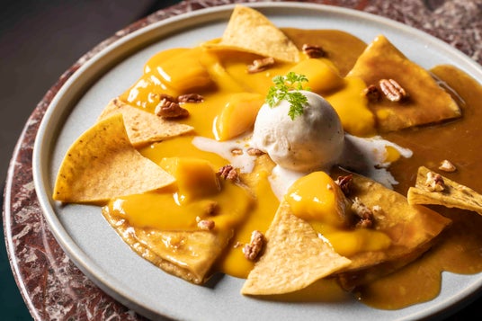 特 徴:トルティーヤをクレープのように薄く焼き上げ、その上に滑らかなバニラアイスクリームをトッピング。ジューシーで甘いマンゴー果実がアイスクリームと見事にマッチし、さらにマンゴーソースがフルーティーな風味を一層引き立てます。仕上げに香ばしいペカンナッツを散りばめ、食感と風味のアクセントがクセになる一品。