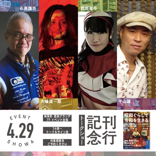 昭和の部屋・モノ・ファッションにこだわる27人が登場する『昭和ぐらしで令和を生きる』の刊行を記念し、書泉グランデでは、本書の著者・平山雄さんのトークショーを開催。ゲストに、本書にも登場するOverLightShow ~大箱屋~の大場雄一郎さん、ラブホテル写真家の那部亜弓さんを迎え、企画・プロデュース・編集をした石黒謙吾さんが司会をつとめます。どうやって「昭和ぐらし」を実現したのか。そのこだわりのポイントは? それぞれが愛する「昭和」について語り合います!