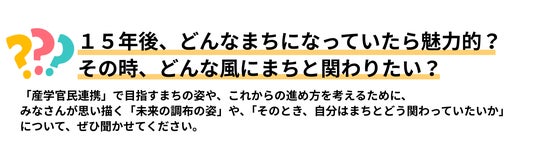 「どのようなまちを目指すか」「どのように進めていくか」について、皆さまが思い描く未来の調布の姿や、将来まちとどのように関わっていたいかを自由にお寄せください。