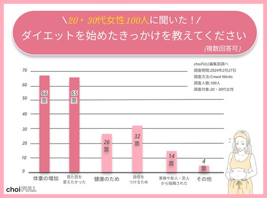 20・30代の女性100人に「ダイエットを始めたきっかけを教えてください」と聞いたところ、約7割が「体重の増加」と回答。同じく、約7割が「見た目を変えたかった」と回答しました。それには、以下の理由が挙げられます。