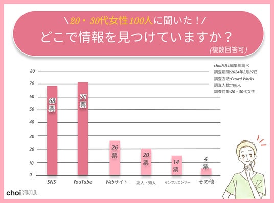 20・30代に「ダイエット情報をどこで見つけていますか」と聞いたところ、7割がYouTube・SNSと回答しました。