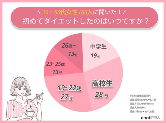 20・30代女性100人に初めてダイエットをした時期を聞いたところ、約半数が中学・高校と回答しました。また、約3割が19~22歳という結果になりました。