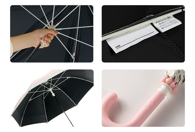 生地裏面にはポリウレタンコーティング加工が施されているため遮熱効果があり、UVカット率・遮光率は全色100%、裏面は全色黒色なのもポイント。大人用日傘と同様の効果を持つ日傘です。またはっ水防水加工も施しているので雨の日でもお使いいただけます。