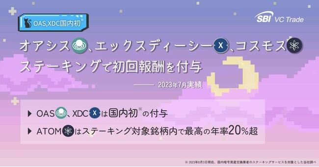 SBI VCトレード株式会社(本社:東京都港区、代表取締役社長:近藤 智彦、以下「当社」)は、2023年8月上旬にオアシス(OAS)、エックスディーシー(XDC)、コスモス(ATOM)について7月分のステーキング報酬の初回付与を行う予定でおりますのでお知らせいたします。