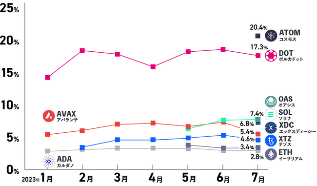 OAS、XDC、ATOMは、2023年7月に当社ステーキングサービスに追加されました。OAS、XDCの2銘柄については国内初のステーキング報酬付与となり、OASが年率7.4%、XDCは年率6.8%の予定です。またATOMのステーキング報酬年率については、当社ステーキング対象銘柄のなかで過去最高年率である20.4%を予定しております。