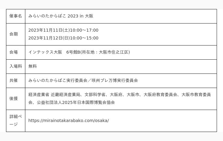 イベントの総合プロデュース事業を展開する株式会社トーガシ(本社:東京都江戸川区、代表取締役 吉田守克)は、2023年11月11日(土)~12日(日)にインテックス大阪(所在地:大阪市住之江区)にて開催する「みらいのたからばこ 2023 in 大阪」に協賛出展いたします。また本イベント会場の施工もサポートさせていただきます。