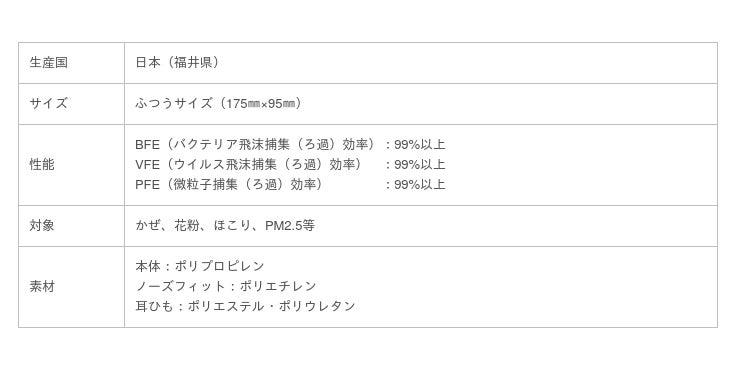 マスクフィルター性能は、BFE(バクテリア飛沫捕集(ろ過)効率)、VFE(ウイルス飛沫捕集(ろ過)効率)、PFE(微粒子捕集(ろ過)効率)が全て99%以上