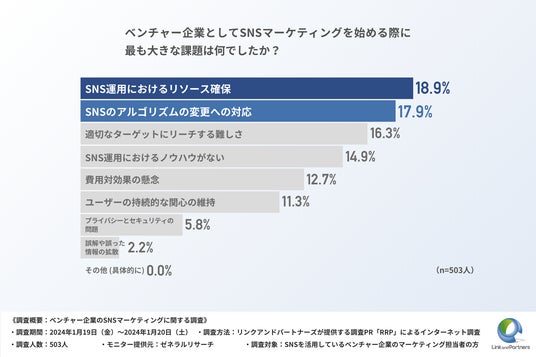 一方で、ベンチャー企業がSNSマーケティングを始める際の主な課題は、「SNS運用におけるリソース確保」(18.9%)、「SNSのアルゴリズム変更への対応」(17.9%)、「適切なターゲットにリーチする難しさ」(16.3%)でした。