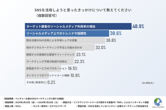 そこで今回、株式会社リンクアンドパートナーズは、SNSを活用しているベンチャー企業のマーケティング担当者の方503名を対象に、「ベンチャー企業のSNSマーケティングに関する調査」を実施しました。