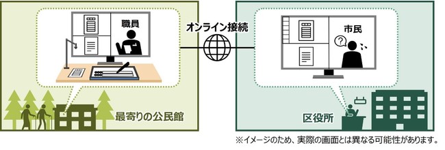 本実証では、公民館など生活圏にある身近な場所に、分かりやすくシンプルな操作でビデオ通話や書類表示、電子的な記入ができる端末を設置し、オンラインによる区役所の各種手続きや相談に関する試行を、市民の協力のもと行います。本実証は2021年12月15日より2022年3月末まで実施する予定です。
