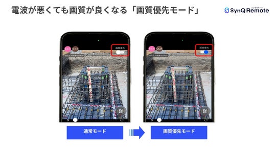 「画質優先モード」電波環境が悪い状況でもクリアな映像を提供できるよう設計されています。画面上部にあるモードを左右に切り替えるだけの簡単アクションで、これまで利用を諦めていた現場でも活用の可能性が広がります。