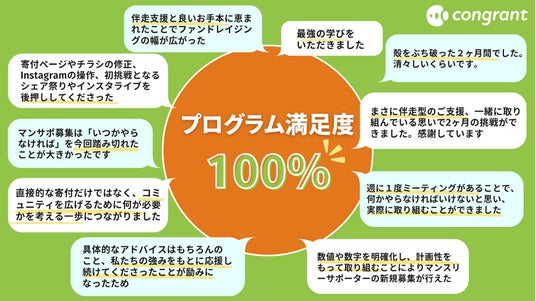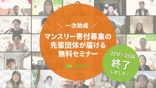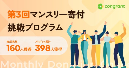 ソーシャルセクターと企業向けに「寄付DXシステム」を提供するコングラント株式会社(本社:大阪市西区、代表取締役:佐藤正隆、以下「コングラント」)は、マンスリーサポーター募集の第一歩を支援するため、コングラント登録団体を対象に「第3回マンスリー寄付挑戦プログラム」を実施しました。プログラムを通して、二次助成参加5団体が合計160人のマンスリーサポーターを獲得しました。