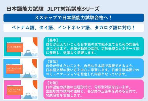 『基本』『文法』『対策』の3STEPでJLPT試験対策のみならず、日本語が総合的に学習できるコンテンツです。動画学習のみならず、振り返りチェックテスト、単元別テスト、語彙リストを内蔵しています。