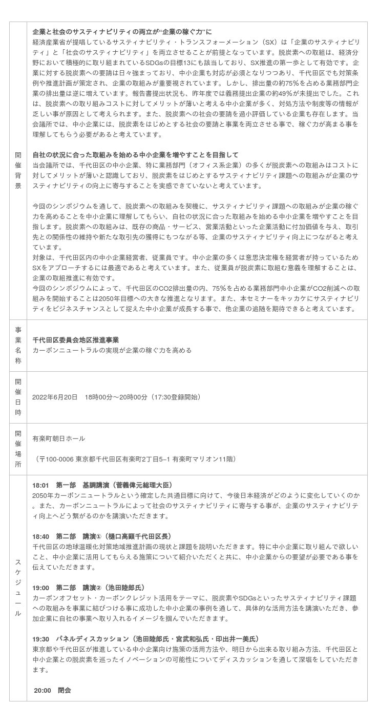 登壇者は、第99代総理大臣で、2020年10月26日の所信表明演説において、日本が2050年までにカーボンニュートラルを宣言した菅義偉元総理大臣。菅氏は2030年に向けて温室効果ガスの削減目標を掲げるなど、カーボンニュートラルを日本で初めて積極的に推進してきた総理大臣です。今回は、2050年カーボンニュートラルという確定した共通目標に向けて講演します。また、開催地区である千代田区の区長・樋口高顕氏にも登壇。国際都市・首都東京の中心に位置し、政治、 経済、文化・教育等多様な中枢機能が集積する千代田区の地球温暖化対策地域推進計画の現状と課題を講演。その他、カーボンフリーコンサルティング(株)の池田陸郎氏の講演に加え、東京都、千代田区を交えたパネルディスカッションも行います。