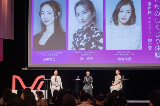 【私たちのしくじり体験~事務長・マネージャー 虎の巻~】ご登壇者:株式会社Liberate Beauty 真山 綾美 氏、医療法人社団SMILE LAND BIANCA CLINIC 菊地 早夏 氏、イーメディカルクリニック麻布 田中 愛里 氏
