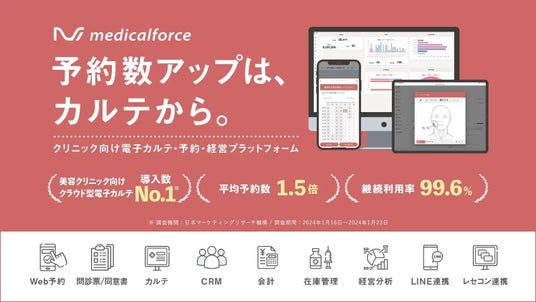 medicalforceは、自由診療クリニック向けオールインワンSaaSです。電子カルテ、予約管理、会計、在庫管理など、クリニックの業務フローに沿った豊富な機能により業務を効率化できるのはもちろんのこと、予約枠の最適化やLINE連携など、予約数の増加や売上向上を実現するための機能が充実しています。規模や診療科目を問わず、400院以上の自由診療クリニックで選ばれ続け、この度、「美容クリニック向けクラウド型電子カルテ導入院数」でNo.1のシェアを獲得※1いたしました。