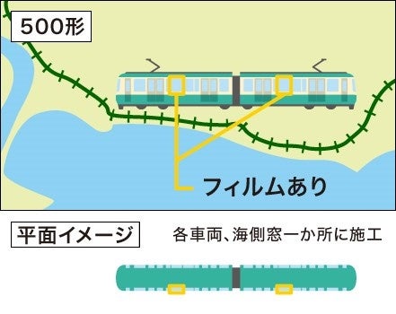 本試験運行では、試験車両として500形の一部の窓にポジカ(R)くっきり(TM)フィルムを施工します。試験車両に乗車されたお客様には、ポジカ(R)くっきり(TM)フィルムを貼った車窓と貼っていない車窓を見比べていただくことができます。また、窓越しに見える景色の見え方や感じ方の違いに関するアンケート調査を期間限定で実施します。
