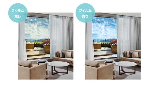 ポジカ(R)くっきり(TM)フィルムを窓に貼ることで、青空や海、緑の木々や赤い花などの色が濃く、鮮やかに感じられたり、青空に浮かぶ雲がより白く感じられたりします。ガラスの飛散を防止する機能と紫外線を99%カットする機能を持ち、室内を守りながら、より豊かな空間体験を提供します。