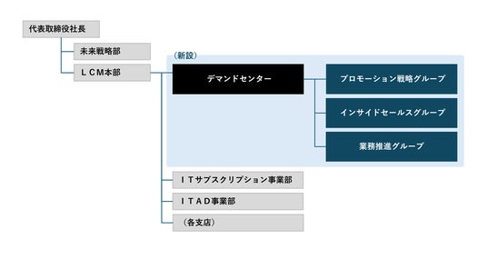デマンドセンターは、各事業部から独立した運営体制を持ち、柔軟かつ迅速にプロモーションおよび業務推進を行います。本センター傘下には「プロモーション戦略グループ」と「業務推進グループ」を配置し、ITサブスクリプション事業部に属していた「インサイドセールスグループ」も移管いたします。これにより、部門間の連携強化とプロモーション活動の一元化を図り、営業活動の精度と効果の向上を目指します。