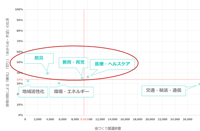 高齢者比率の高い地域における、街づくり分野別の不満件数と文章解析AIの感情分類によるネガティブ率をみると、「医療・ヘルスケア」「教育・育児」は不満件数・ネガティブ率ともに高く(=優先課題)、「防災」は不満件数は少ないがネガティブ率が高い(=潜在課題)傾向にあることがわかった。