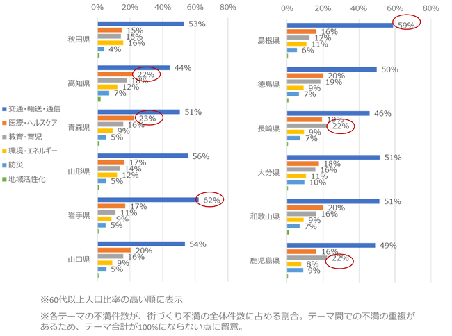 また、高知県・青森県では「医療・ヘルスケア」の不満が、長崎県・鹿児島県では「教育・育児」の不満がそれぞれ2割を超えていた。